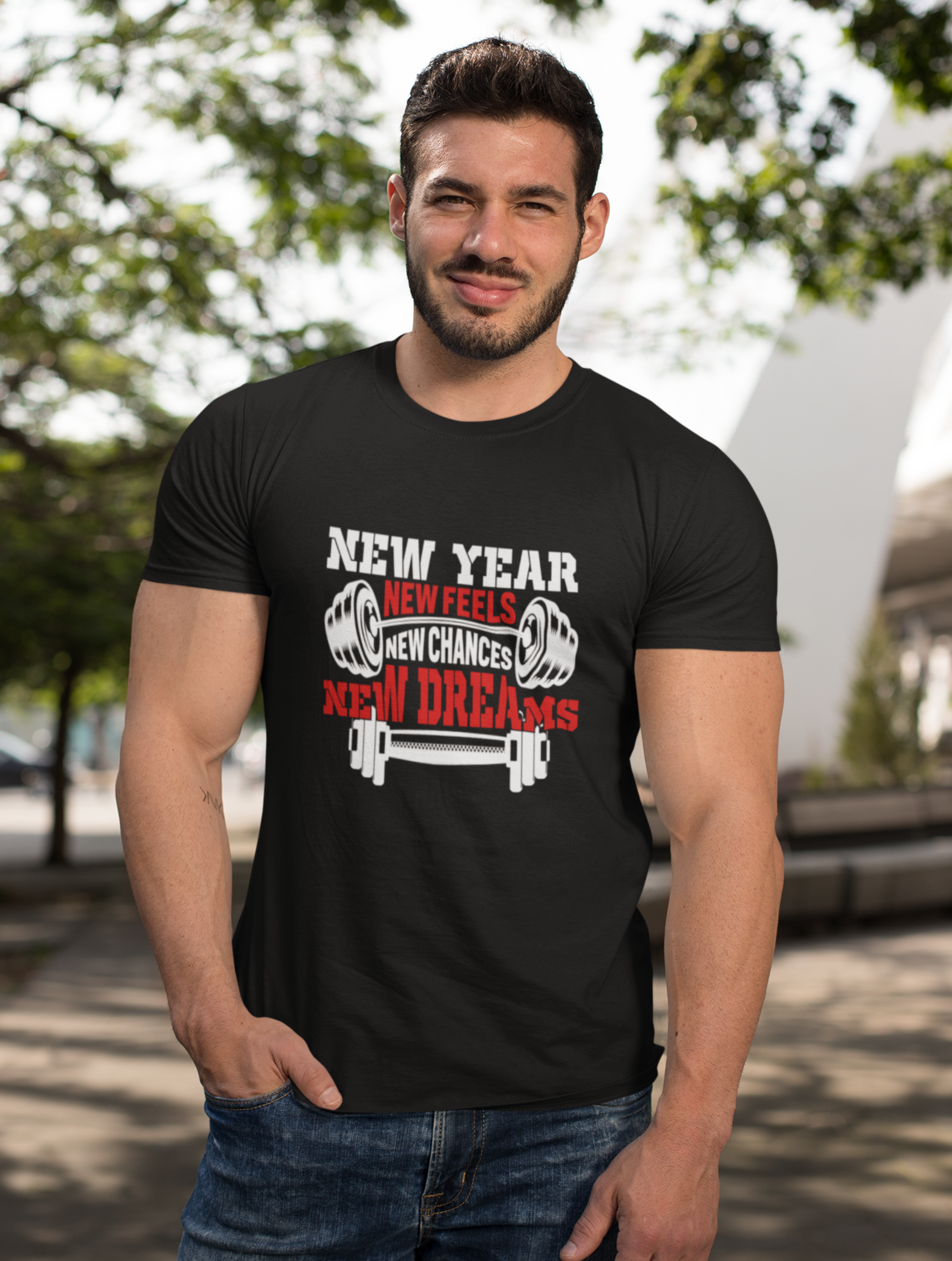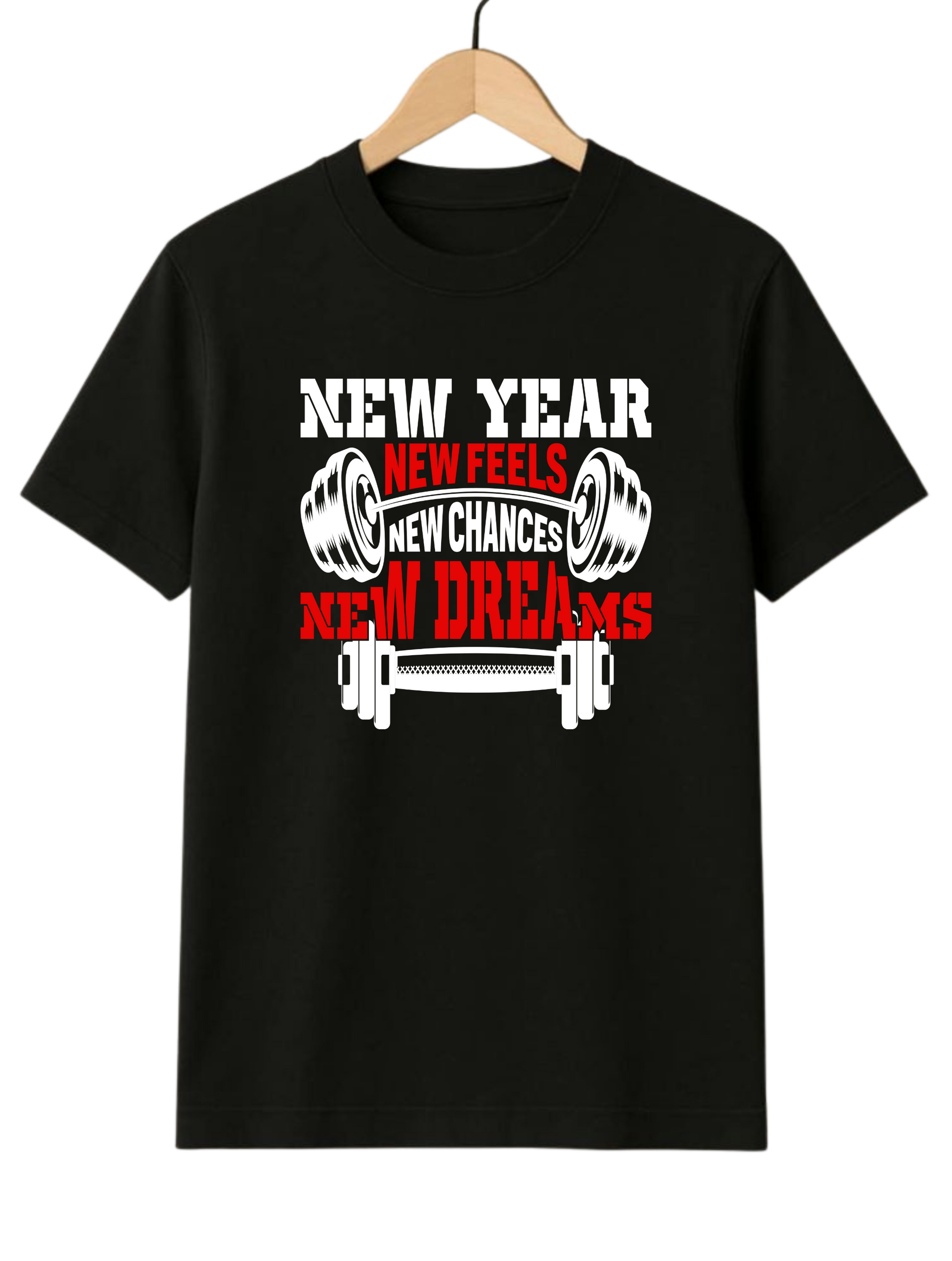 New Year New Feels Motivational Regular Fit Black T-shirt